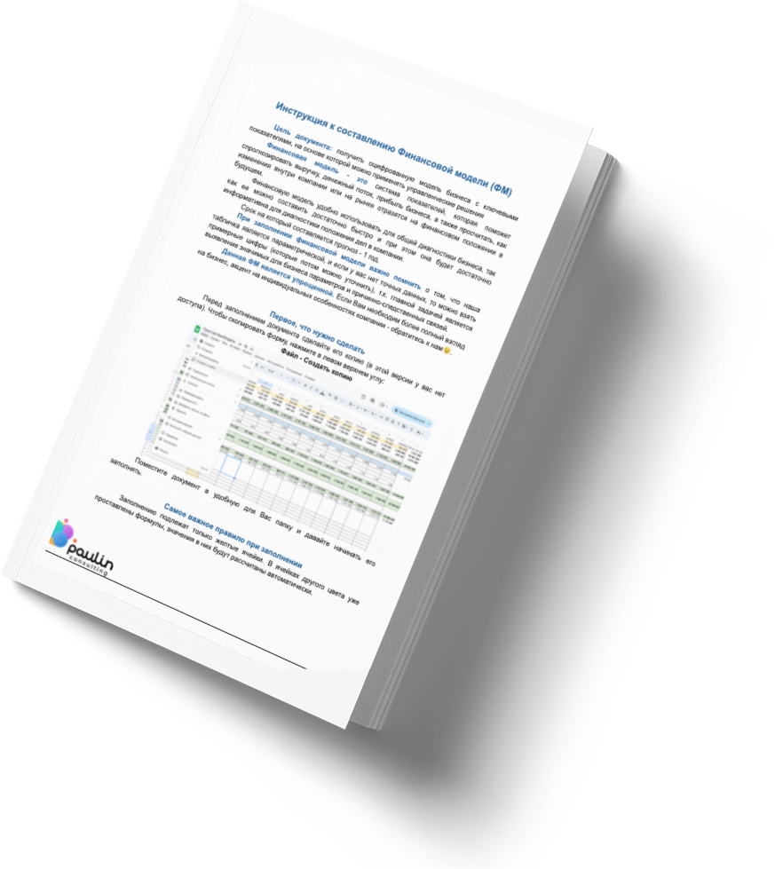 Скачайте шаблон для расчета финансовой модели с пошаговой инструкцией, как самостоятельно рассчитать финансовую модель, а также, как выявить рычаг для роста выручки, и как действовать дальше, чтобы ничего не сломать